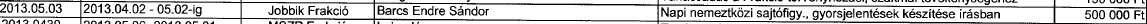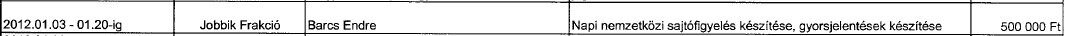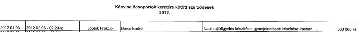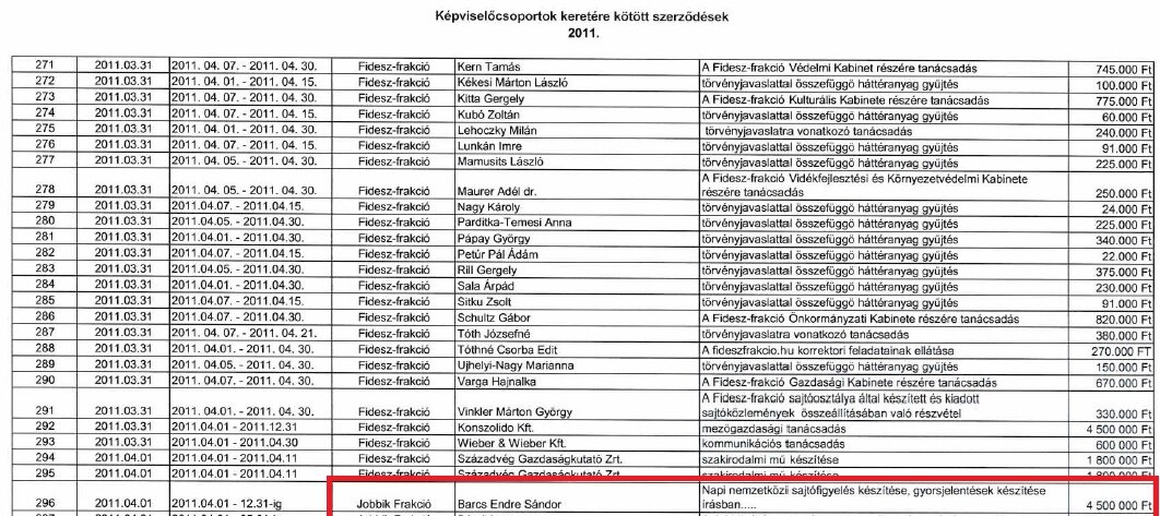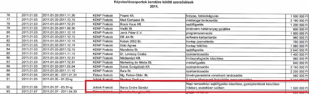 Vona és Szabó a Jobbik-frakció választóktól kapott pénzéből közvetlenül havi fél milliót fizetett Barcs Endrének 2011-ben, majd 2012-ben és 2013-ban még háromszor fél milliót. Adatok forrása: Országgyűlés, a frakciók keretére kötött szerződések listája, lásd a képfájlokat.